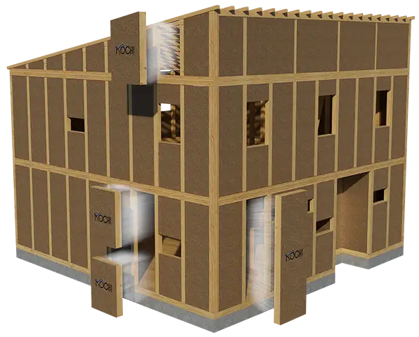 構造面材・枠材・間柱(まばしら)・断熱材のすべてを一体化して製造された「コーチパネル」は、建物の耐震性能を大幅に向上させる先進的なパネル構造です。これらの部材を一体成型することで、地震時にかかる力(地震力)を点や線ではなく、パネル全体の面でバランスよく受け止め、効果的に分散させることができます。