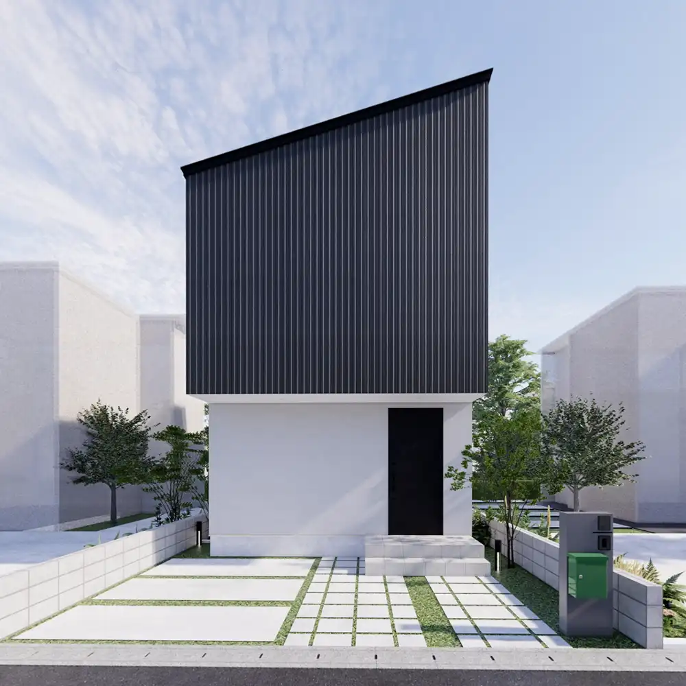 無垢スタイルの『無垢ノーススタイル』は、北側道路の敷地専用の注文住宅です。南道路や角地などに比べ一般的に割安な土地に、その特徴を個性として捉え魅力的なプランをご用意いたしました。リビングを2階に配置することで開放的かつプライバシーが守られる暮らしやすい間取りを実現しました。個性的な外観デザインに開放的な室内空間。多くの方の解決策になるであろうアイデアの詰まった家づくりです。
