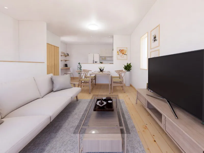 無垢ノーススタイルは、シンプルながらもリビングの在り方にこだわりました。2階に設計されたリビングは、住宅密集地でも光を取り込みやすく、普段過ごす団欒の場で良好な眺望を得ることができます。また、外からの視線を避けやすくプライバシーが確保されるので、周囲を気にすることなく家族みんなでプライベートな時間をお寛ぎいただけます。