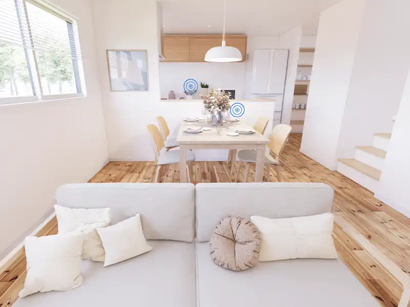 玄関を通るとそこに広がるのはキッチンを主体とした快適なリビング。2階へ上がる階段はリビング階段を採用し、常に住まい人の通り道となるため、家族を直接感じることができます。