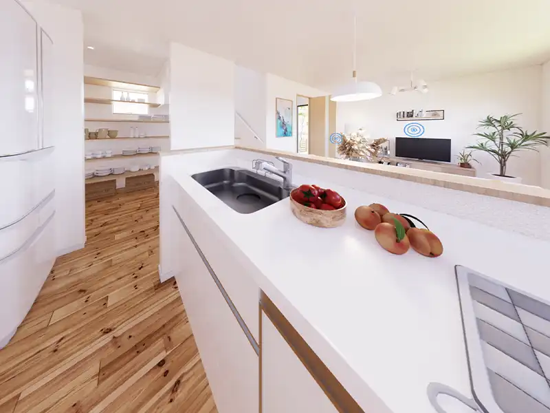 限られたスペースでも快適に料理ができるペニンシュラ型キッチンを採用しました。リビングにいる家族と会話をしながら料理ができるので、いつもの料理が楽しく有意義な時間となることでしょう。