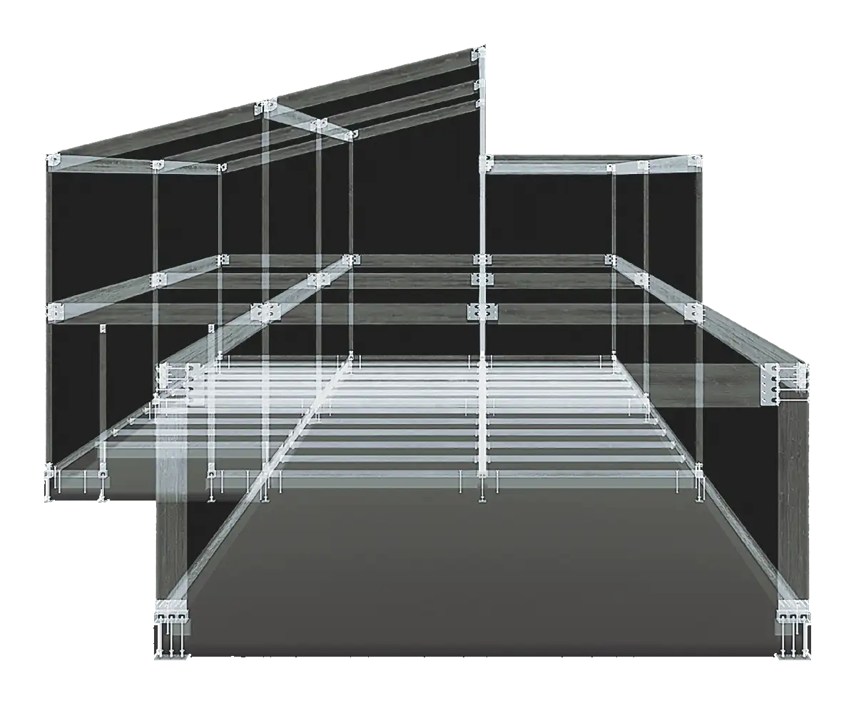 近年、脱炭素社会の流れで木造化が進む中、SE構法は4~5階建て木造ビルに対応。耐火要件を満たしながら、構造設計の強みでコスト削減・納期短縮・施工性向上を実現します。