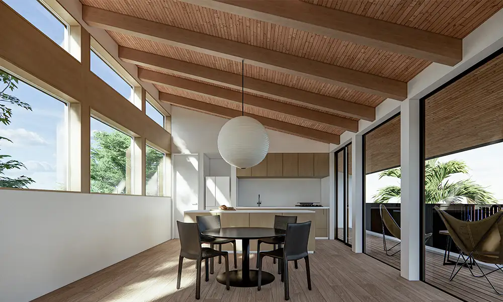 狭小地でもSE構法なら登り梁で勾配天井をつくり、最上階に広がりと収納スペースを確保。ドーマー窓から光を取り入れ、明るく心地よいLDKを実現できます。