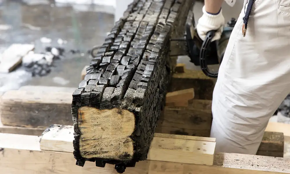 防火地域でも木を見せる仕様が可能。柱を太くし表面が炭化しても倒壊しない構造です。
